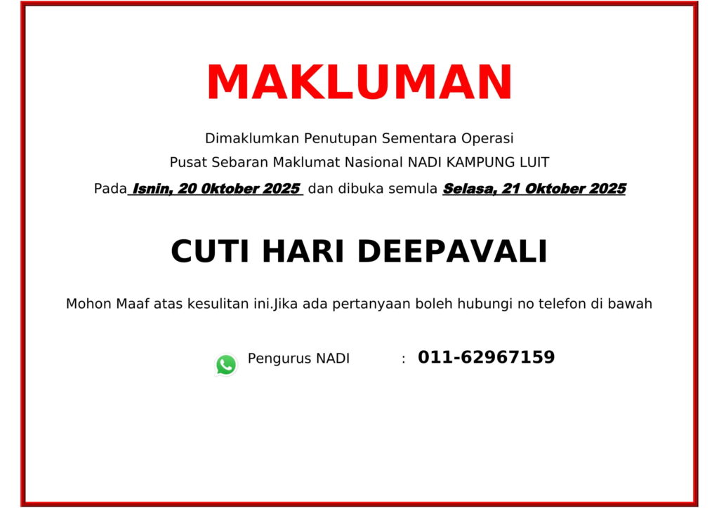 MAKLUMAN PENUTUPAN NADI SEMPENA CUTI UMUM HARI DEEPAVALI